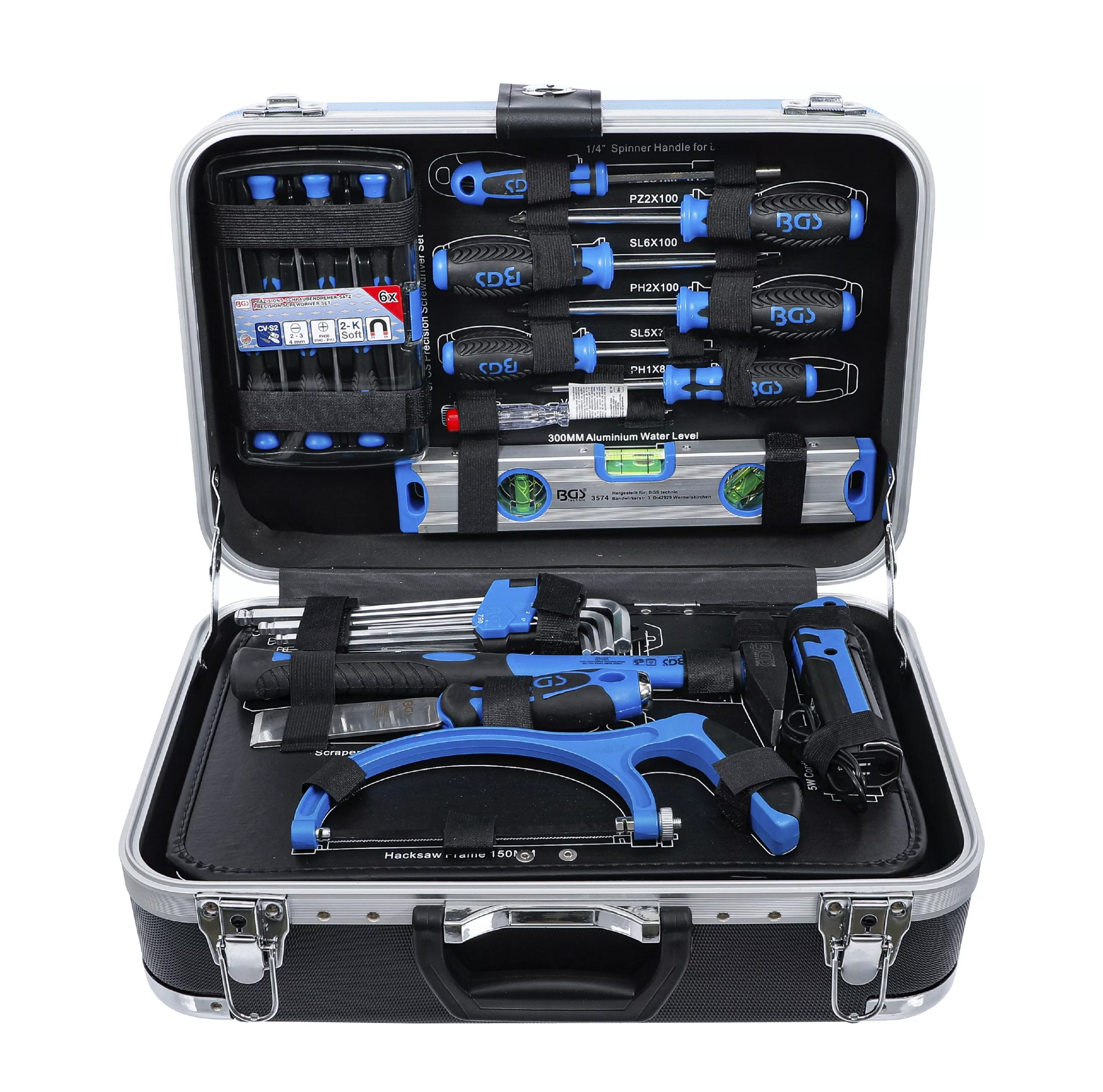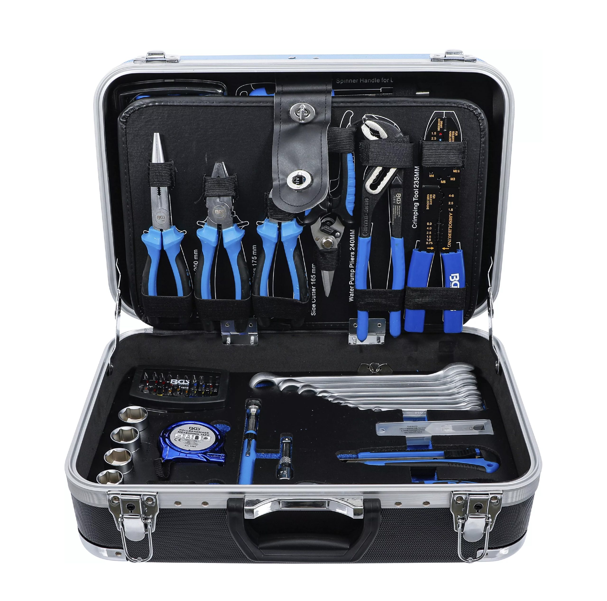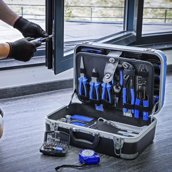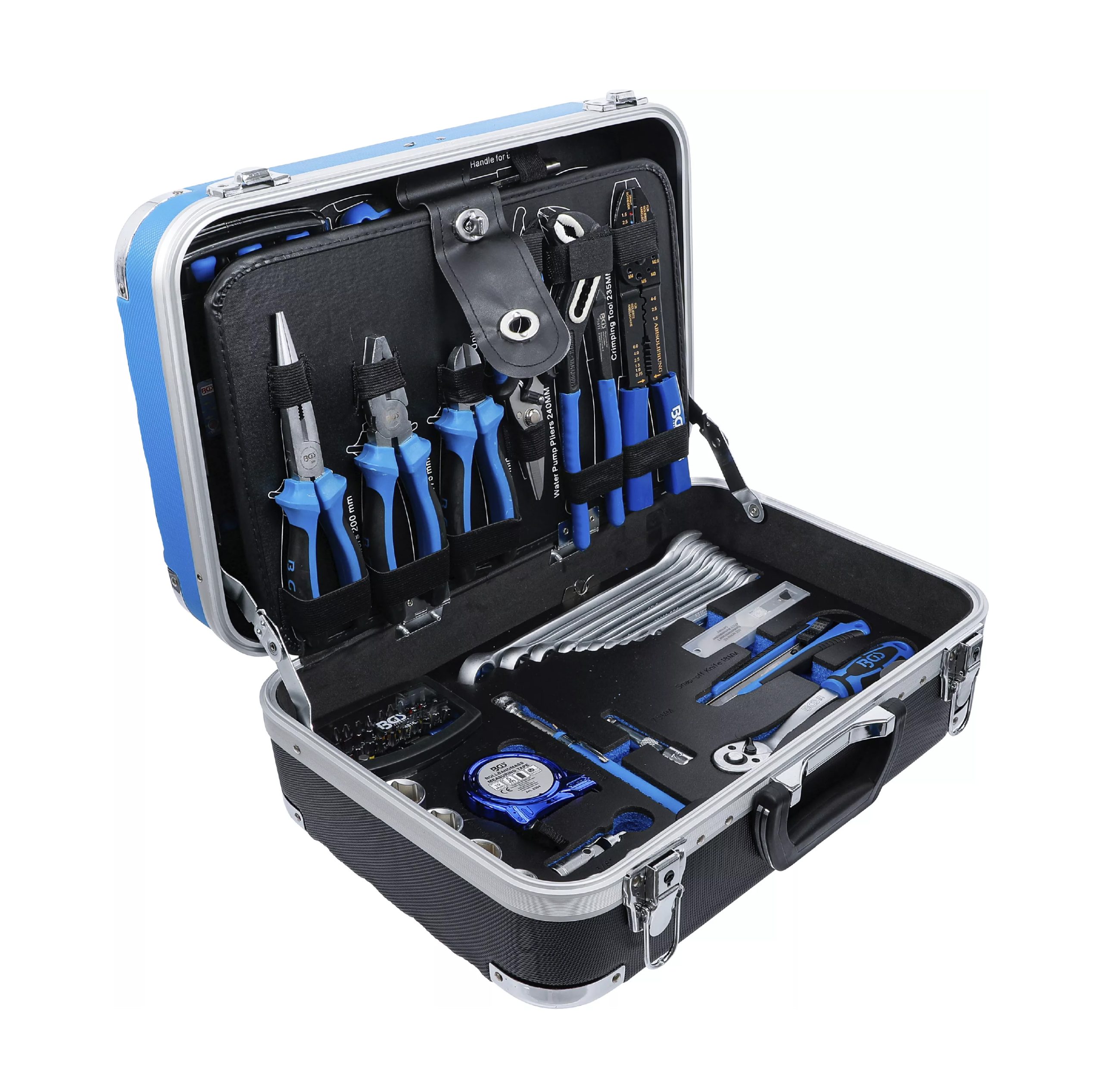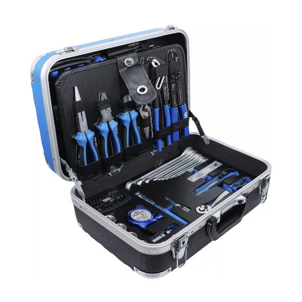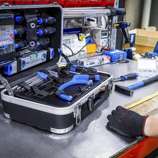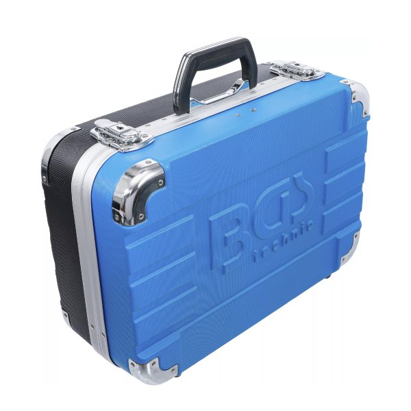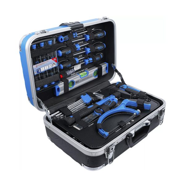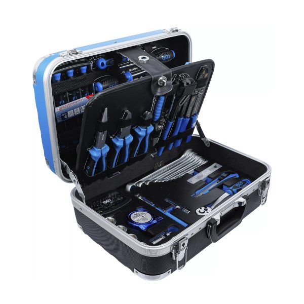 Orodje je shranjeno v robustnem ABS kovčku z ojačanimi vogali, ki učinkovito ščitijo pred poškodbami in zagotavljajo dolgo življenjsko dobo. Med transportom so vsi deli varno pritrjeni z elastičnimi trakovi ter kavlji in zankami. Orodne plošče so izdelane iz MDF lesnovlaknenih plošč, ki odbijajo umazanijo, spodnji del pa je opremljen z EPE penastim vložkom iz kakovostne trde pene, ki vsakemu orodju nudi svoje stalno mesto.
